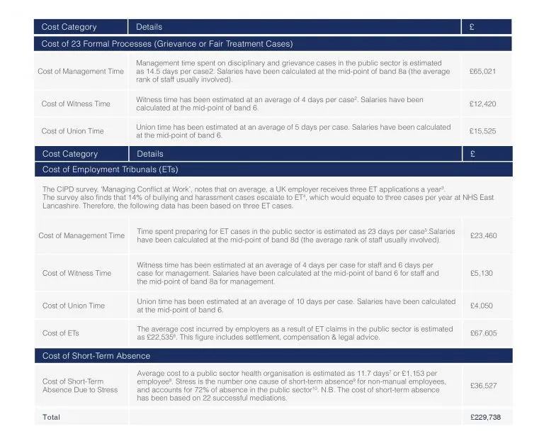1 This calculation is based on the cost of using formal processes vs. mediation. Set up costs for training accredited mediators are not included nor are the training costs associated with formal processes. 2 CIPD (2004). Managing Conflict at Work, p.9 and CIPD (2007). Managing Conflict at Work, p.4. 3 CIPD (2004). Managing Conflict at Work, p.4. 4 Ibid., p.20. 5 Ibid., p.11. 6 CIPD (2007). Managing Conflict at Work, p.24. 7 CIPD (2008). Absence Management, p.6. 8 Ibid., p.16. 9 Ibid., p.21. 10 Ibid., p.23.