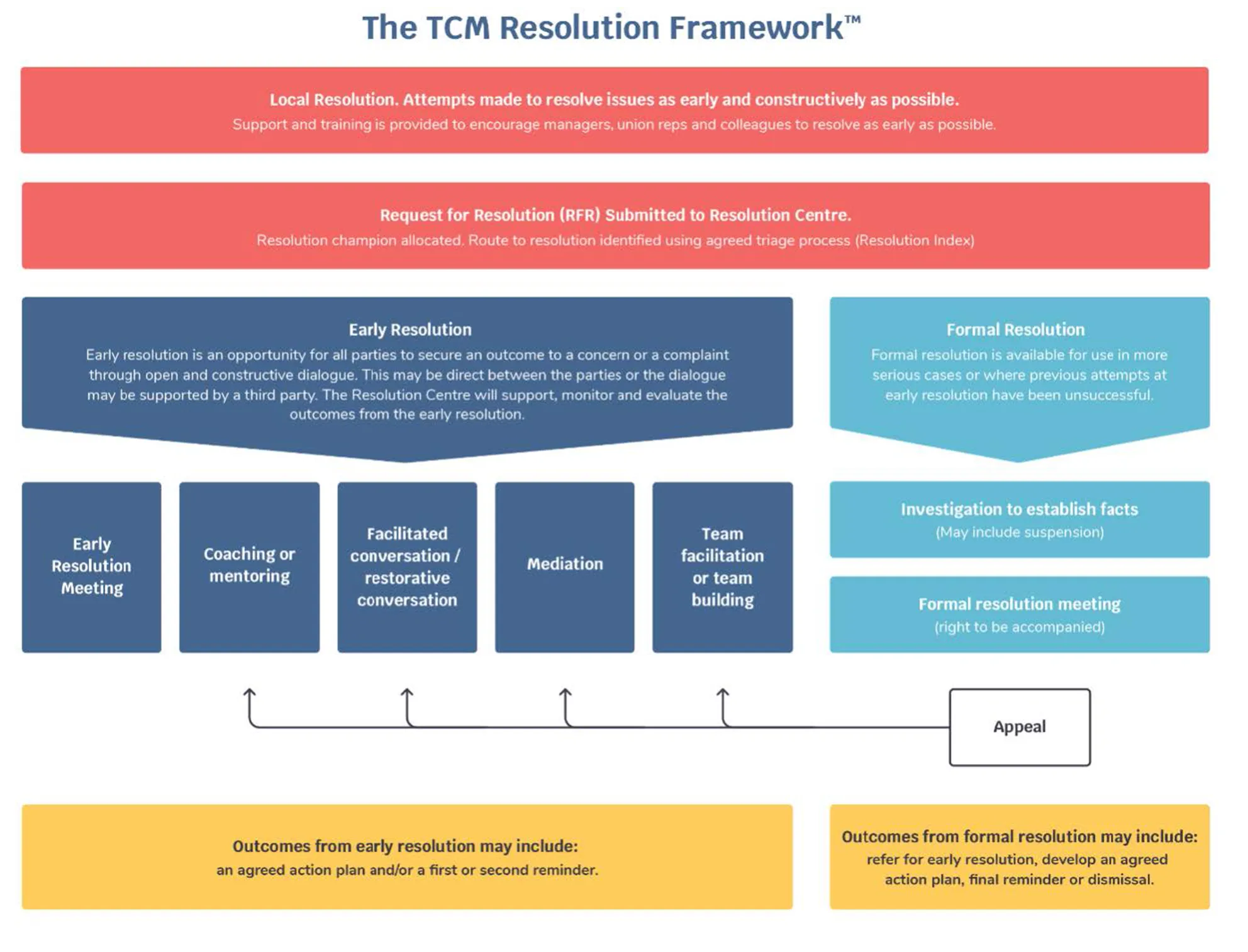 The Resolution Framework starts with the premise that it is the responsibility of the local line manager to resolve any situations as early and constructively as possible. This usually takes the form of an early, informal resolution meeting, where the people concerned are able to discuss their disagreements or concerns openly and honestly, in a safe and supportive space. In the vast majority of cases, this approach generates a successful resolution and no further action is needed. Should problems start to arise again, a Resolution Champion will be on hand to help nip any issues in the bud and get everyone back on track. The success of an early resolution meeting does of course depend greatly on the line manager having